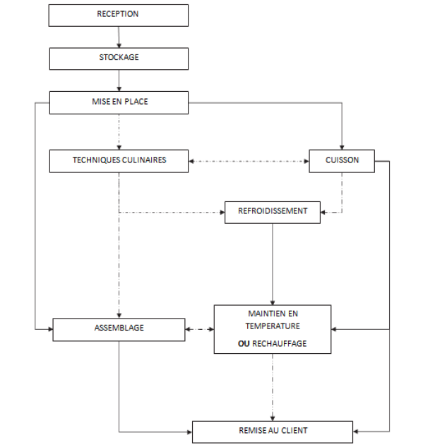 Le diagramme ci-dessous représente les principales étapes de travail lors de la fabrication en restauration commerciale. Chaque professionnel a la possibilité d'adapter ce diagramme à sa propre fabrication. Les diagrammes de fabrication pour chaque recette retenue sont élaborés à partir de ce diagramme.