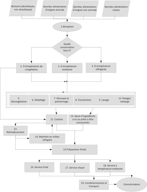 Service (à température ambiante) | O | O | O | O | Contamination biologique, chimique ou physique ou par des allergènes due à des ustensiles de service contaminés ou à une manipulation inappropriée | PRP 4: Maintenance technique et étalonnage PRP 5: Contamination physique et chimique due au lieu de production |
