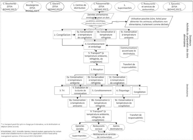 Les étapes des dons alimentaires sont reprises dans l’organigramme ci-après (figure 9). Comme indiqué dans les lignes directrices de l’Union européenne relatives aux dons alimentaires, la nature de l’activité d’une organisation (redistribution et charité) détermine les règles spécifiques qui s’appliquent au titre du cadre réglementaire de l’Union pour la sécurité des aliments et l’information des consommateurs sur les denrées alimentaires. En particulier, le fait qu’une organisation redistribue des denrées alimentaires à une autre organisation (c’est-à-dire «d’entreprise à entreprise», même s’il s’agit d’un centre de redistribution) ou directement à un bénéficiaire final («d’entreprise à consommateur», pour un supermarché) ainsi que le type d’activité qu’elle exerce (par exemple préparation de repas dans un restaurant social) peuvent donner lieu à des exigences différentes en matière de traçabilité, d’hygiène alimentaire et d’information sur les denrées alimentaires. Il s’ensuit que les organigrammes applicables aux centres de distribution, aux supermarchés ou aux restaurants sociaux peuvent aussi s’appliquer aux organisations participant à la chaîne du don alimentaire.