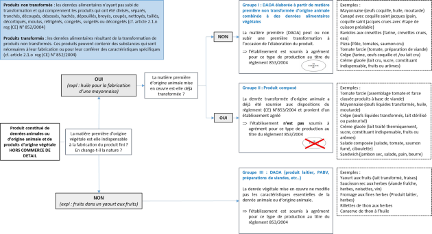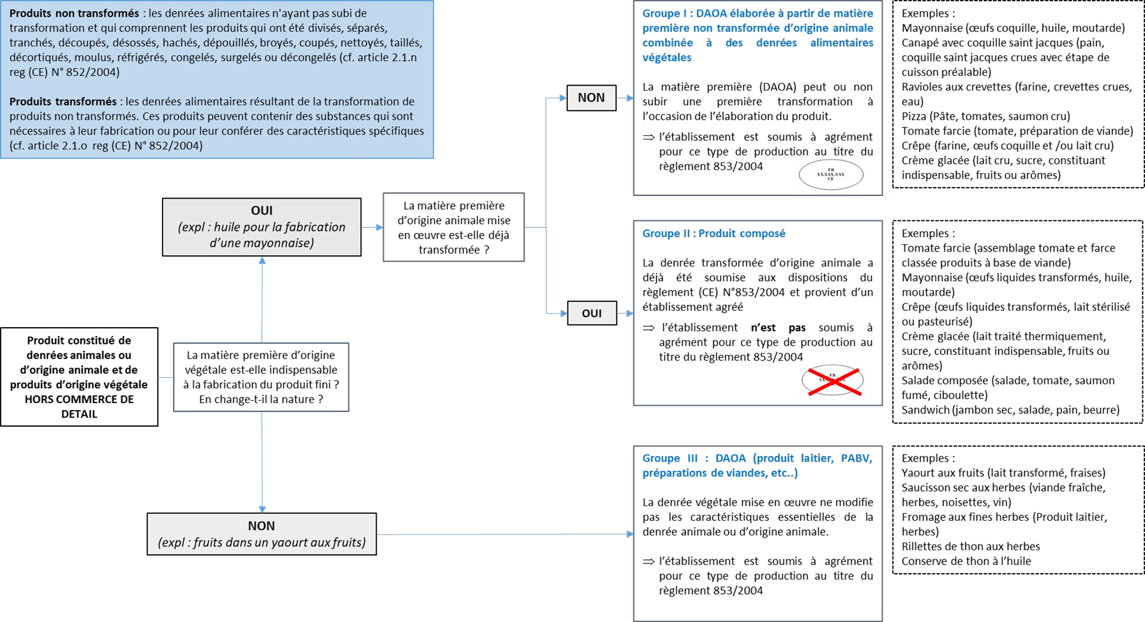 Les établissements élaborant des produits composés à partir de DAOA (denrée animale ou d’origine animale) déjà transformées et de produits d’origine végétale ne sont pas soumis à agrément pour cette activité, conformément à l’article 1 du Reg CE 853/2004, mais doivent respecter les dispositions du Reg CE 852/2004. Les produits d’origine animale transformés utilisés pour la préparation de ces denrées doivent être obtenus et manipulés conformément aux exigences du Reg CE 853/2004.