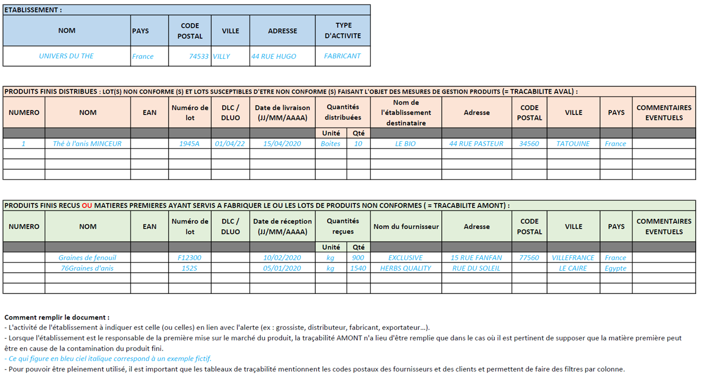 La réglementation prévoit que la traçabilité soit fournie aux autorités sur demande. Pour des raisons pratiques et d’efficacité du suivi des alertes, le guide crée une demande tacite de l’administration de transmission des données de traçabilité précisées dans le tableau de l’ANNEXE V. |
