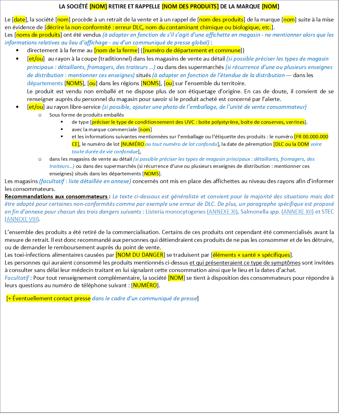 Les magasins (facultatif : liste détaillée en annexe) concernés ont mis en place des affichettes au niveau des rayons afin d’informer les consommateurs. Recommandations aux consommateurs : Le texte ci-dessous est généraliste et convient pour la majorité des situations mais doit être adapté pour certaines non-conformités comme par exemple une erreur de DLC. De plus, un paragraphe spécifique est proposé en fin d’annexe pour chacun des trois dangers suivants : Listeria monocytogenes (ANNEXE XI), Salmonella spp. (ANNEXE XII) et STEC (ANNEXE XIII). L’ensemble des produits a été retiré de la commercialisation. Certains de ces produits ont cependant été commercialisés avant la mesure de retrait. Il est donc recommandé aux personnes qui détiendraient ces produits de ne pas les consommer et de les détruire, ou de demander le remboursement auprès du point de vente. Les toxi-infections alimentaires causées par [NOM DU DANGER] se traduisent par [éléments « santé » spécifiques]. Les personnes qui auraient consommé les produits mentionnés ci-dessus et qui présenteraient ce type de symptômes sont invitées à consulter sans délai leur médecin traitant en lui signalant cette consommation ainsi que le lieu et la dates d’achat. Facultatif : Pour tout renseignement complémentaire, la société [NOM] se tient à disposition des consommateurs pour répondre à leurs questions au numéro de téléphone suivant : [NUMÉRO]. [+ Éventuellement contact presse dans le cadre d’un communiqué de presse] |