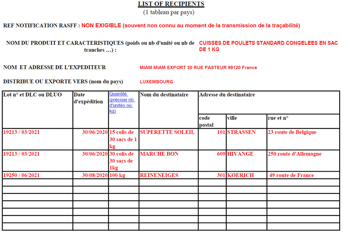 transmettre ces mêmes informations aux autorités compétentes (DDecPP) afin qu’elles soient en mesure de notifier l’information sur le réseau européen d’alerte RASFF (Rapid alert system for food and feed). Pour transmettre la traçabilité aval aux autorités, l’exploitant devrait renseigner le tableau « List of recipients » (cf. précisions au paragraphe dédié ci-dessous).
