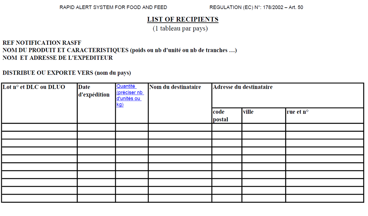 Ce tableau « Liste des destinataires » est un support harmonisé au niveau européen et traduit dans les différentes langues de l’Union européenne. C’est le format à privilégier pour transmettre via le RASFF la traçabilité aval d’un produit distribué hors France.